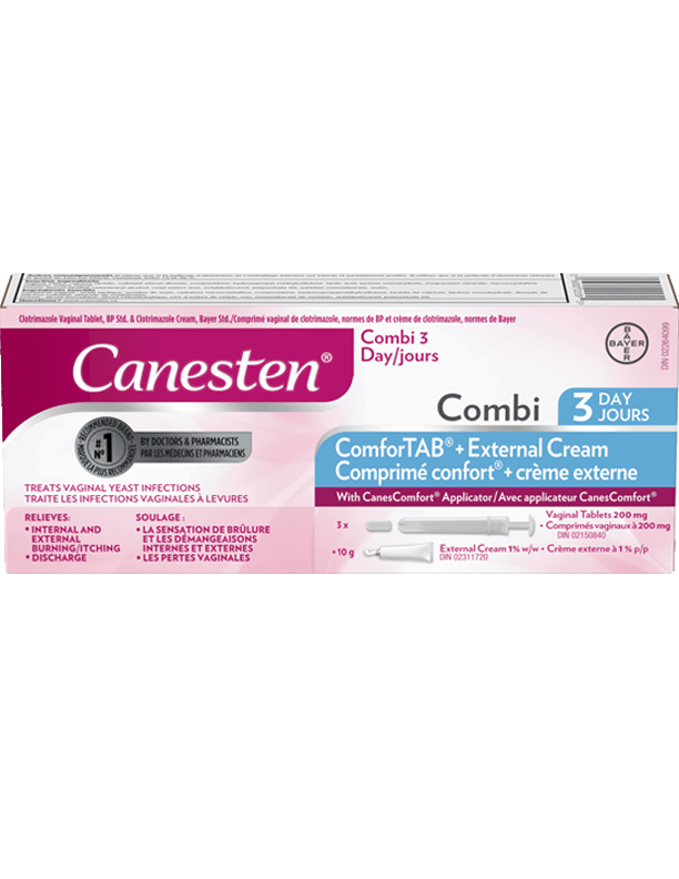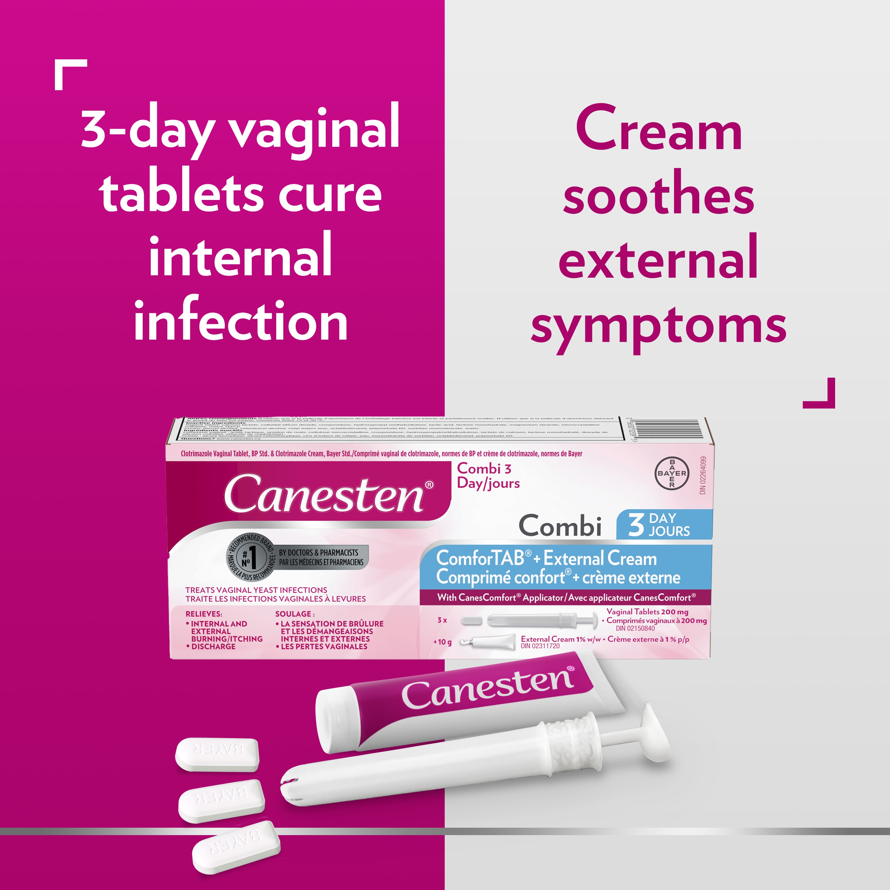 Canesten® Combi 3 Day ComforTAB® + External Cream is a complete, effective two-step treatment. Canesten® Combi 3 Day treats both the cause and the symptoms of a VYI.