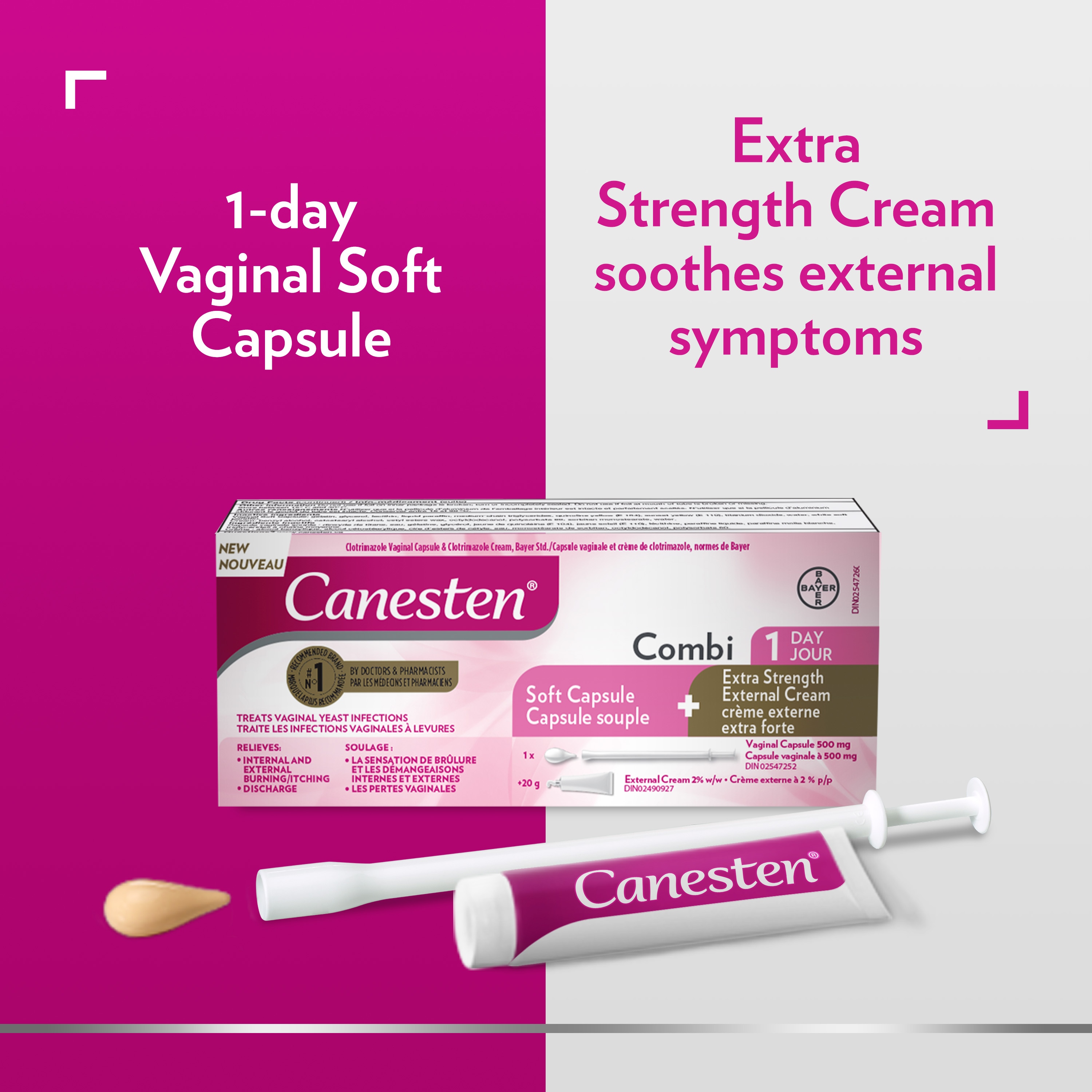 The Canesten® Combi 1 Day Vaginal Soft Capsule + Extra Strength External Cream is a complete, effective two-step treatment. The Soft Capsule, designed to be more comfortable to insert, cures most vaginal yeast infections after 1 vaginal application with relief of symptoms occurring in a few hours or days. The included extra strength cream provides extra relief of external symptoms.
