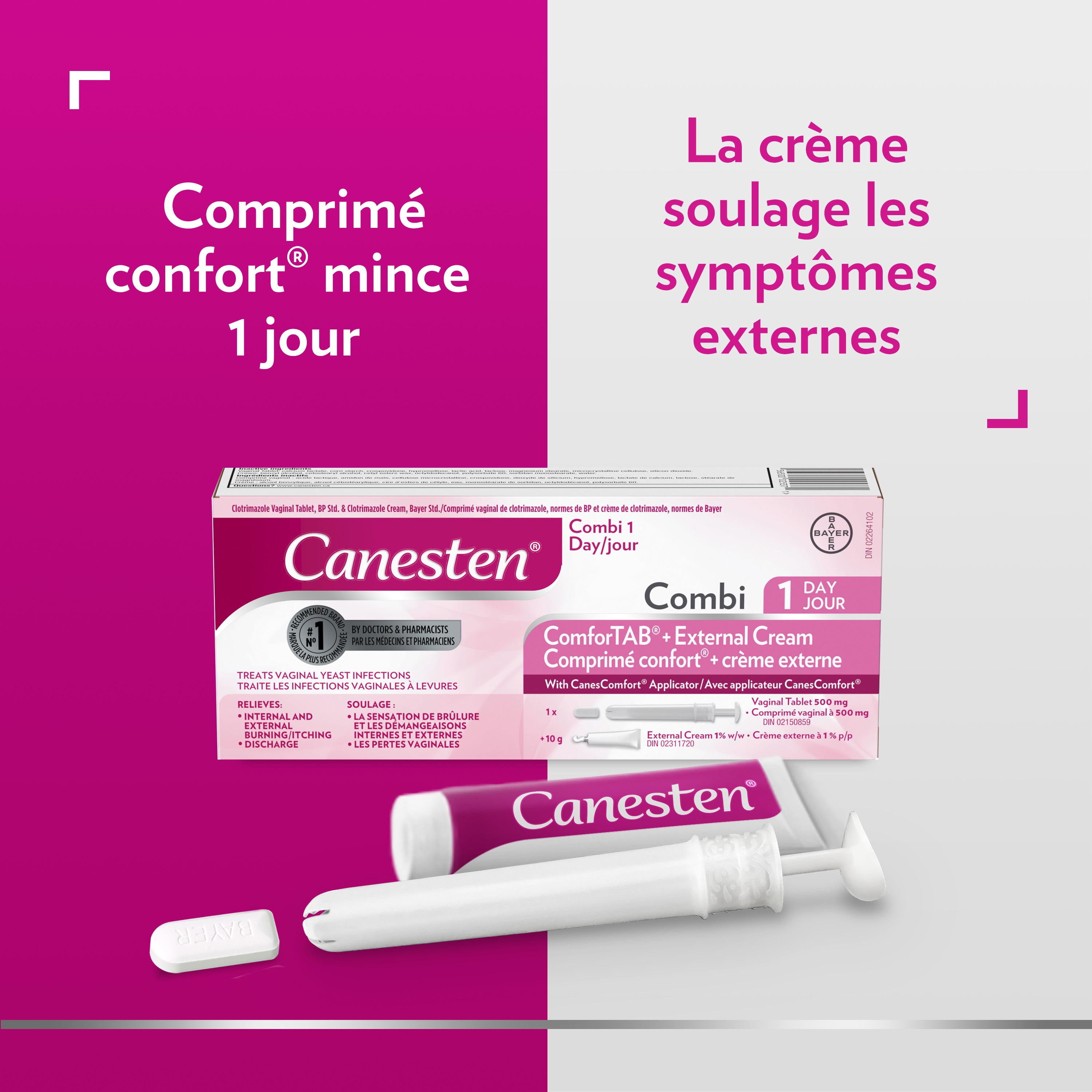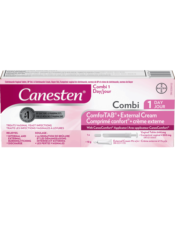 Canesten® Combi Comprimé confort® + crème externe 1 jour est un traitement complet efficace à 2 étapes. Canesten® guérit la plupart des infections vaginales après 1 seule application et soulage les symptômes en quelques heures ou quelques jours. La crème offre un soulagement supplémentaire des symptômes externes. Le Comprimé confort® Canesten®, un mince comprimé vaginal que bien des femmes préfèrent en raison de sa propreté et de sa commodité, est inséré profondément dans le vagin à l’aide de l’applicateur CanesComfort®.