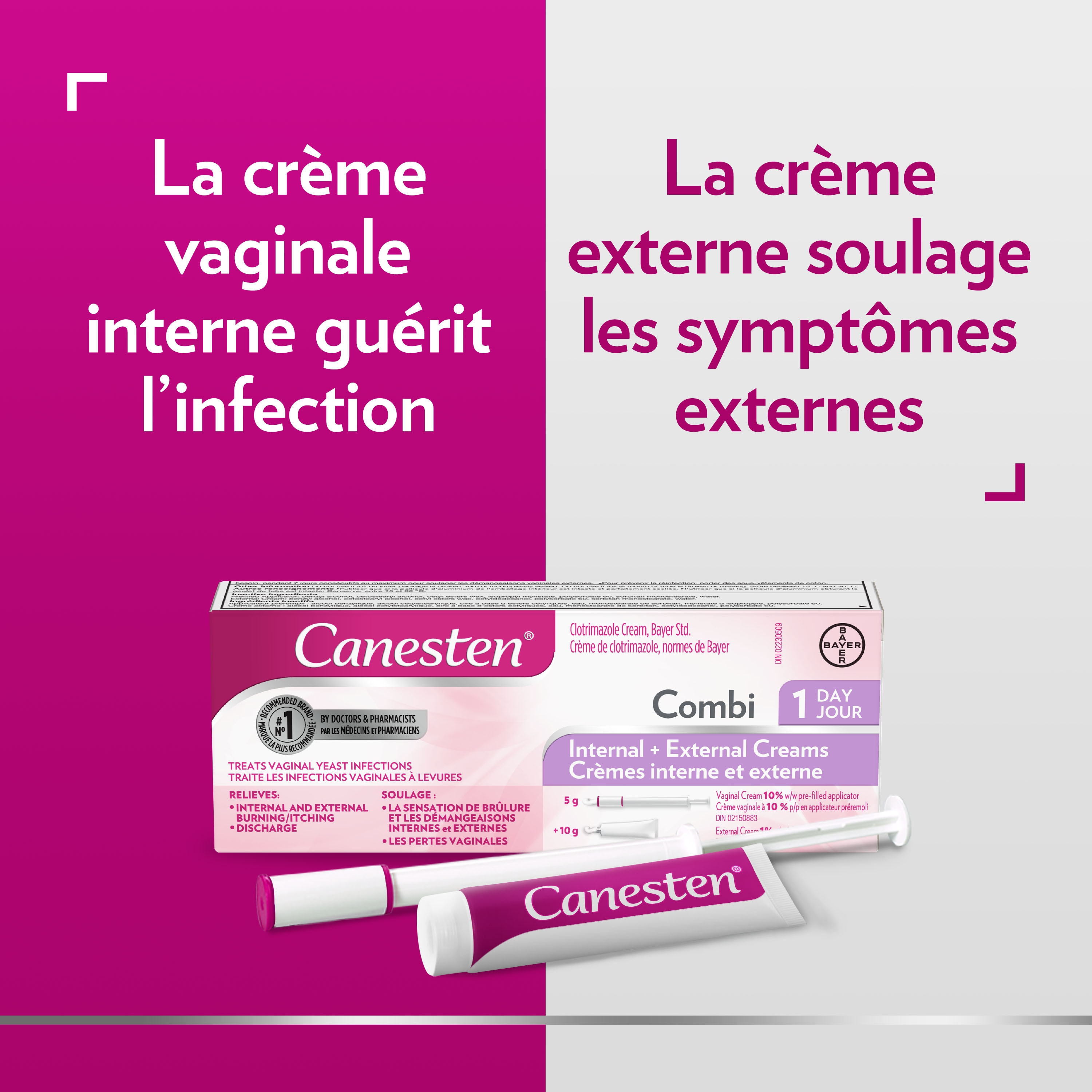 Canesten® Combi Crèmes interne et externe 1 jour est un traitement complet et efficace en 2 étapes. Canesten® Combi Crèmes traite à la fois la cause et les symptômes de l’infection vaginale à levures. La crème vaginale interne apaisante traite les symptômes internes. La crème externe soulage les symptômes vulvaires, comme les démangeaisons et la sensation de brûlure.