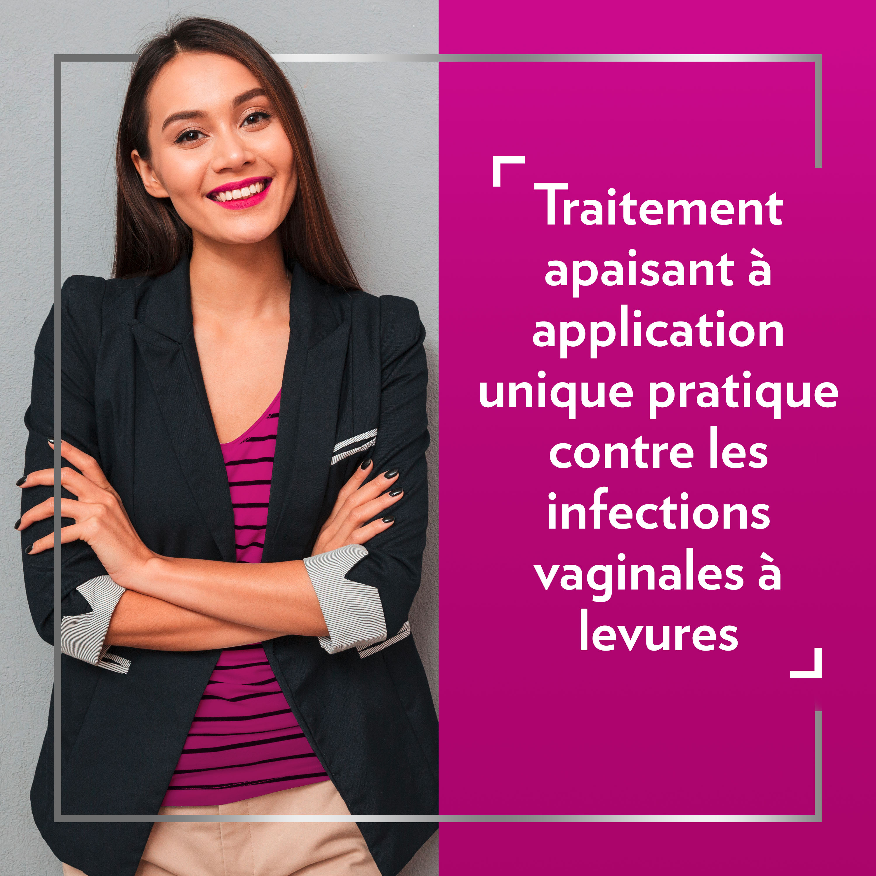 Applicateur pratique à dose unique prérempli de crème vaginale interne qui guérit l’infection. Crème externe qui soulage les symptômes vulvaires, comme les démangeaisons et la sensation de brûlure