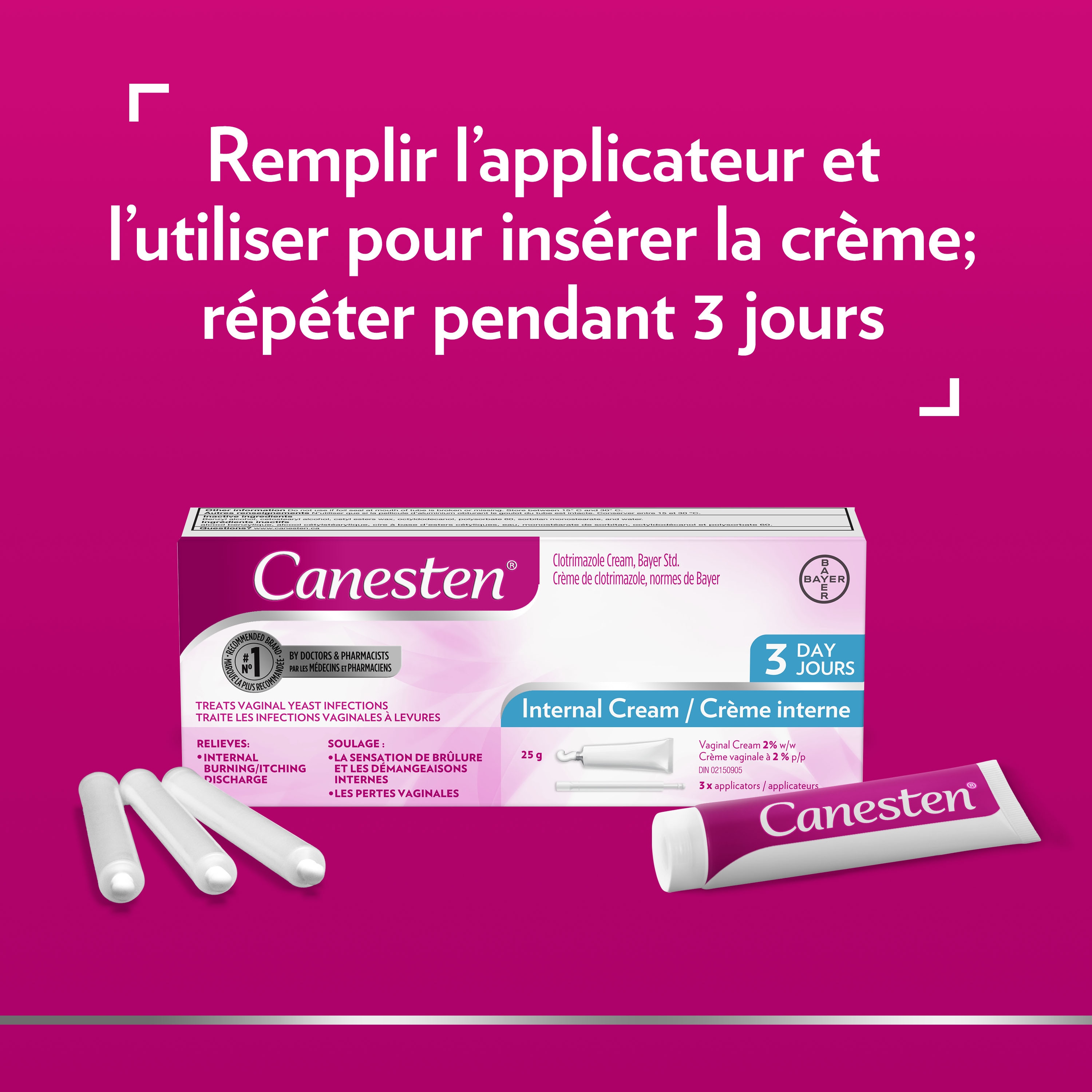 Canesten® Crème interne 3 jours offre un traitement efficace contre les infections vaginales à levures. La crème vaginale apaisante doit être utilisée pendant trois jours consécutifs.
