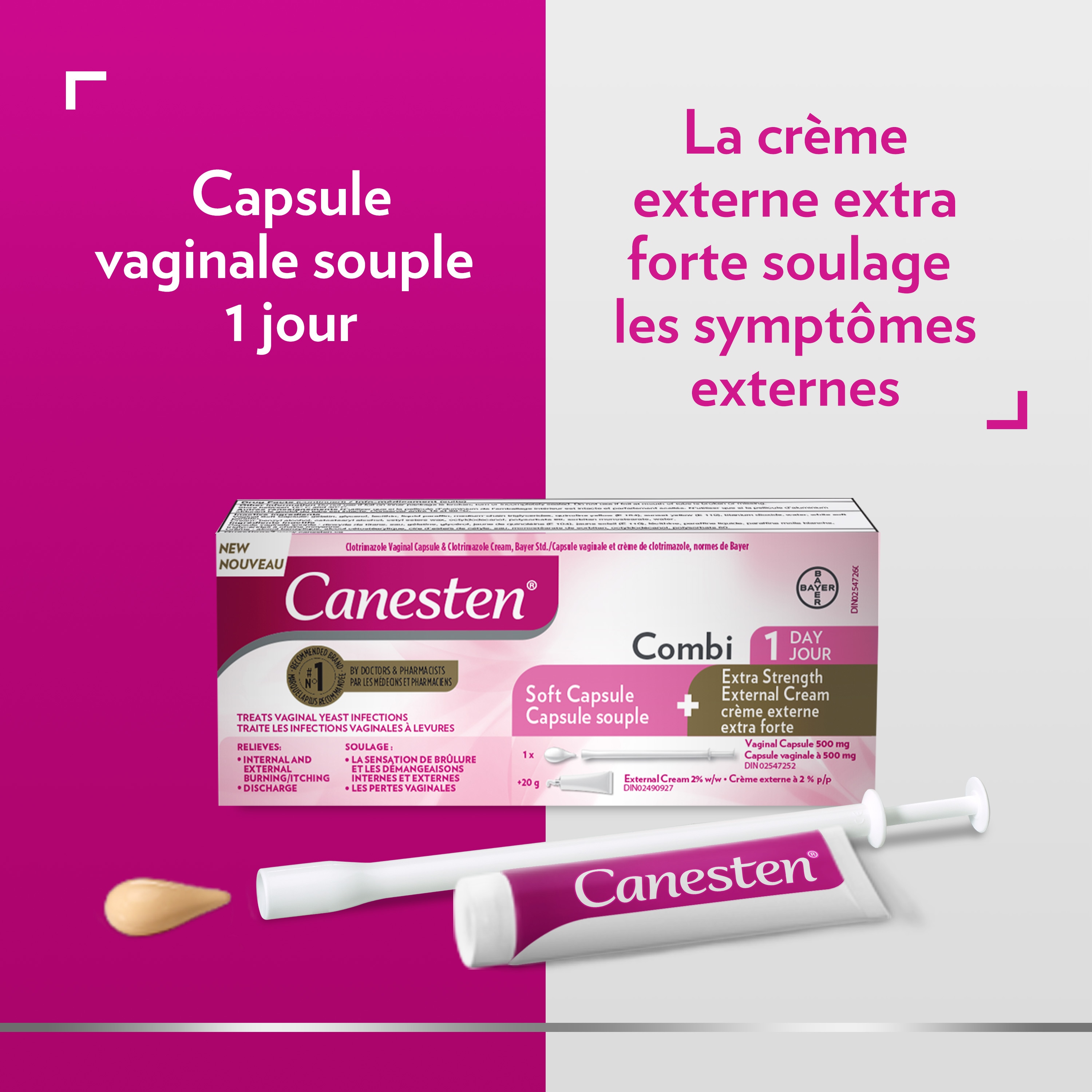 Canesten® Combi Capsule vaginale souple + crème externe extra forte 1 jour est un traitement complet et efficace en 2 étapes. La capsule souple, conçue pour être plus facile à insérer, permet de guérir la plupart des infections vaginales après 1 seule application et soulage les symptômes en quelques heures ou quelques jours. La crème extra forte offre un soulagement supplémentaire des symptômes externes.