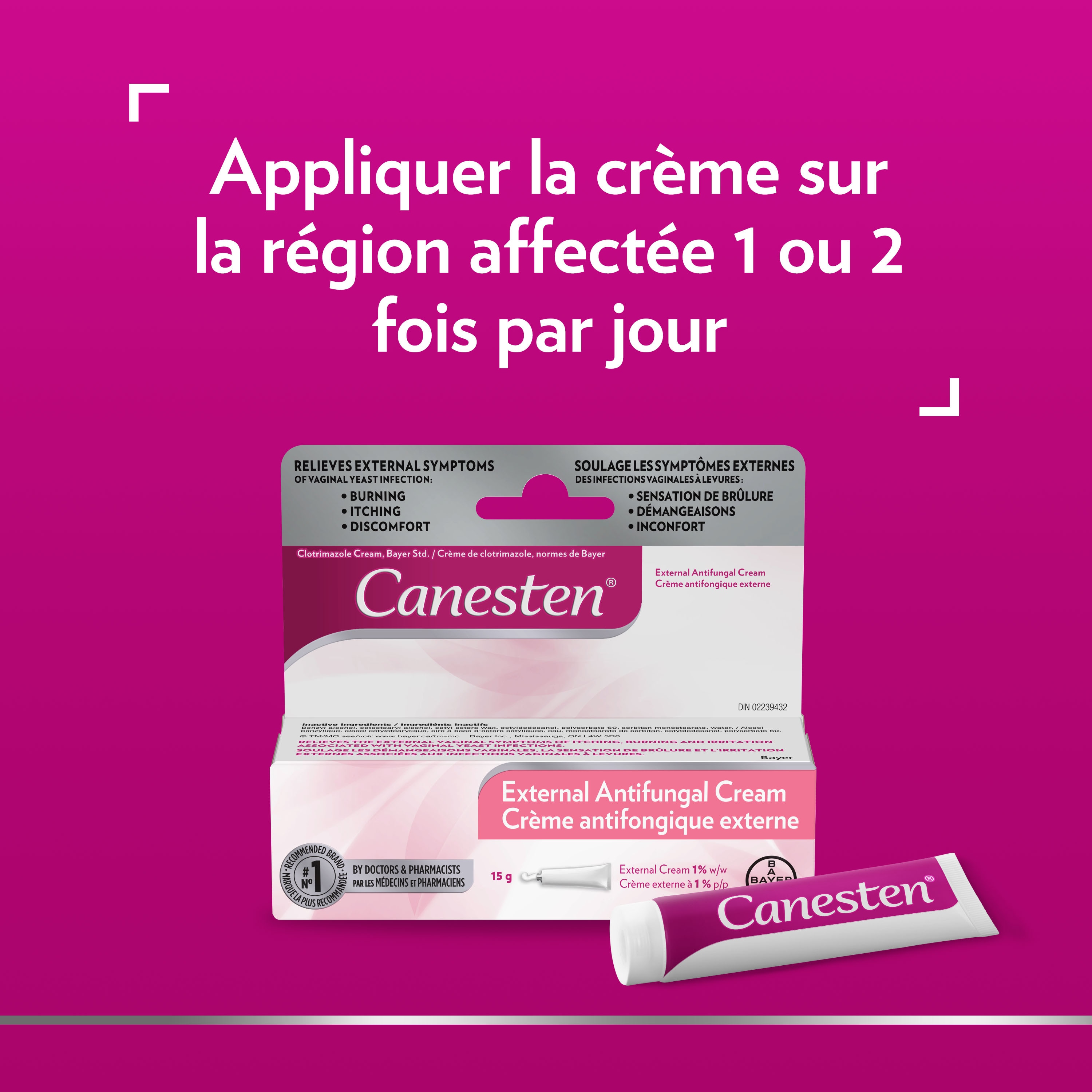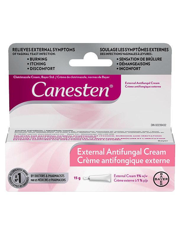 Canesten® Crème antifongique externe procure un soulagement efficace et apaisant des symptômes externes de l’infection vaginale à levures, comme les démangeaisons et la sensation de brûlure. Ce produit ne doit pas être utilisé seul; il peut être utilisé en association avec les comprimés vaginaux et les crèmes internes Canesten® ou CanesOral®.