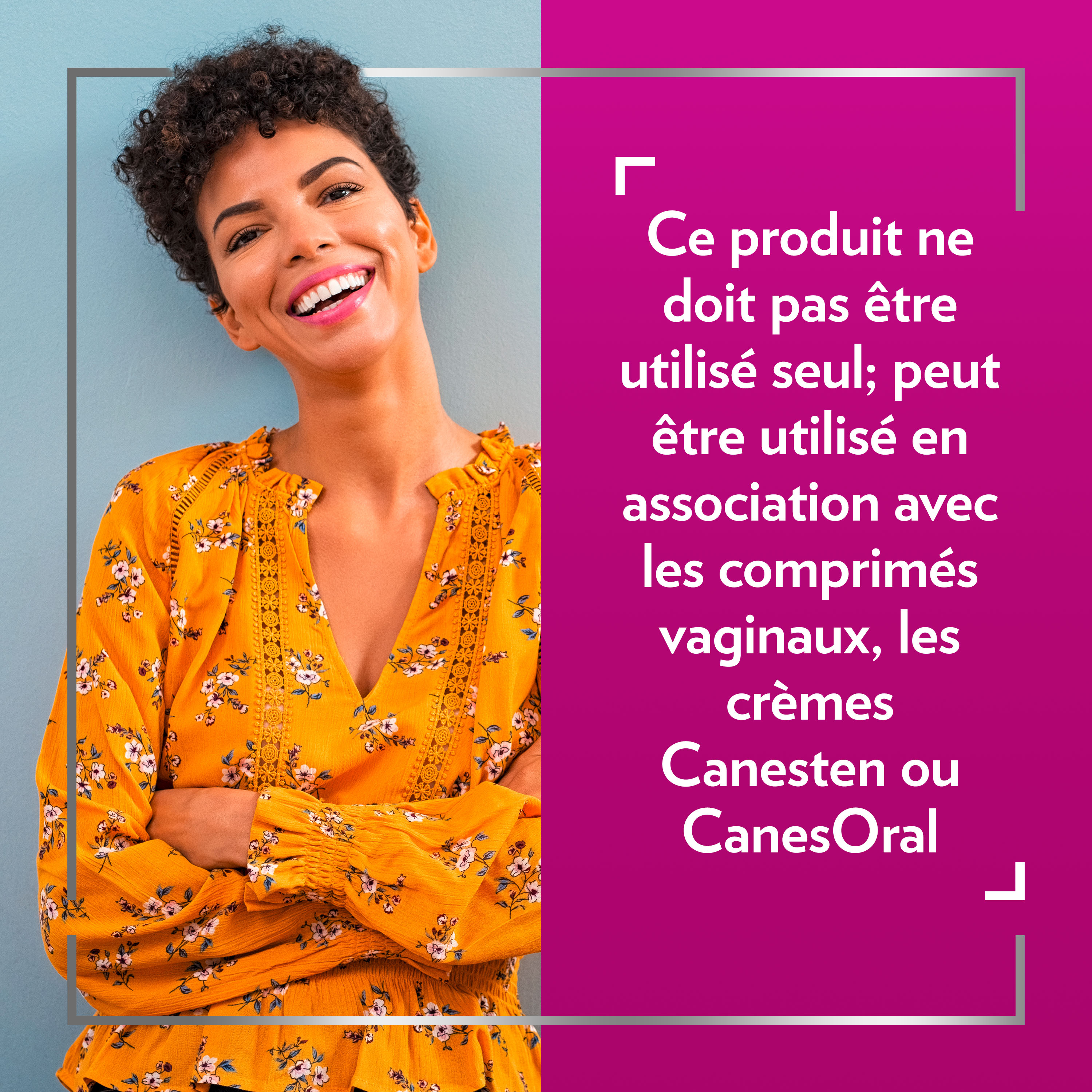Ce produit ne doit pas être utilisé seul; il peut être utilisé en association avec les comprimés vaginaux et les crèmes internes Canesten® ou CanesOral®.